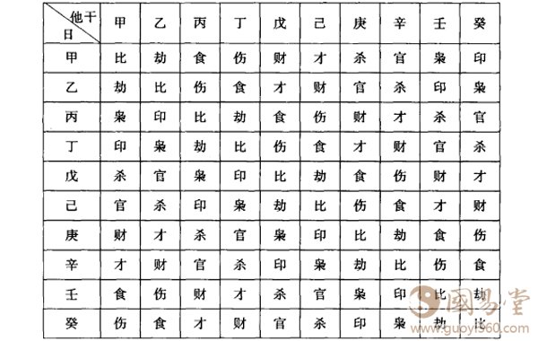 日干与十神对应关系表格如下,初学者刚开始可以查用下表: